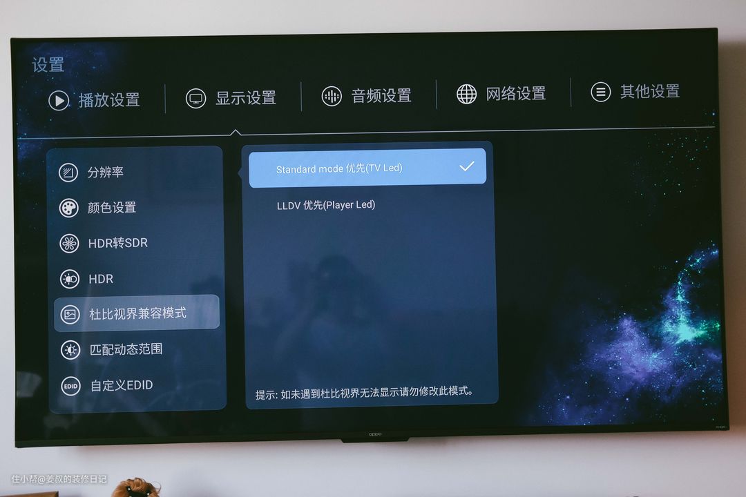 直接选【自动】,这样HDR10的影片会自动进入HDR模式,在播放的时候,电视页面会有HDR标识;杜比视界选择【Standard mode优先】模式。设置完成后,HDR10和杜比视界的片源芝杜都能以最优方式输出。