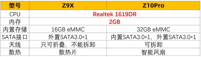 Z10Pro是Z9X升级版,单在CPU和内存核心配置上差距不大,比如两款都是采用Realtek 1619DR,内存都是2GB,差别主要在Z10Pro内置存储增加到32GB,自带一个硬盘盘位,天线可以拆卸,并且是通过智能风扇散热,而Z9X只有16GB,只能通过SATA接口扩展,天线无法拆卸,散热只能靠内置的散热片,然后就是外观方面,会有少许的差异。