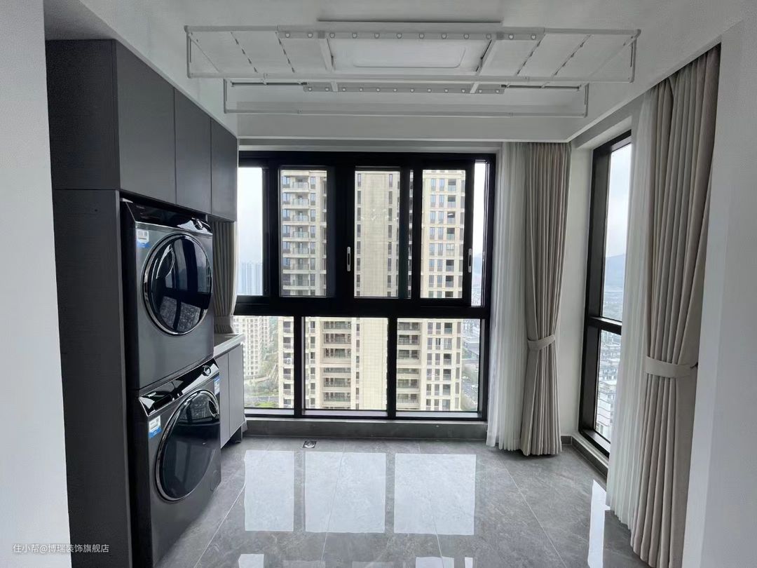 ▪️阳台打通后客厅空间变得更为敞亮。吊柜门板和地柜门板均采用门板下延式隐形拉手,美观的同时还方便开合,显得更加现代简约。做了门板全包的设计,有种一门到顶的既视感,非常大气,洗手池台面,使用石英石,更耐用。将洗衣机和烘干机嵌入柜子里,可以充分利用空间,避免占用室内有限的空间,提高居室的使用效率。搭配智能折叠晾衣架很实用,可以方便地将洗好的衣服自然晾晒或烘干,缩短衣物晾晒时间,保持衣物的质量和色彩。