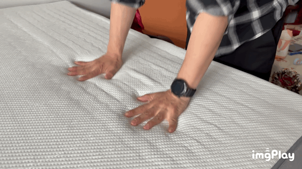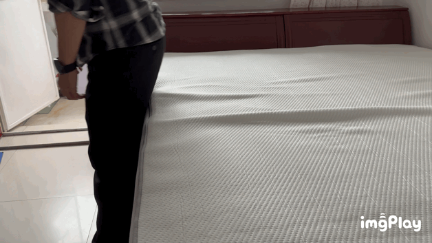 正常力度用手向下挤压,可以通过动图效果感受其柔软程度!这款柔软度评分大概6.28左右,相比我之前使用过的床垫,偏软一些,材质摸起来更加舒适、细腻!