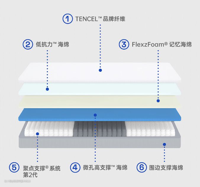 我购买的这款蓝盒子Z1-Pro床垫采用六层优质原材料,最上面一层采用TENCEL品牌纤维,含有30%的木源纤维,摸起来舒适、丝滑!且透气性好,不用担心细菌的滋生。而内部的微孔高支撑海绵,又起到一个透气的气温分散层的作用,疏散闷热感,提升床垫的清爽舒适度!抵抗力海绵与FlexFoam记忆海绵的加入,又大大提升了床垫的柔软与细腻程度,躺在床垫的一瞬间,仿佛整个身体都被融化般~