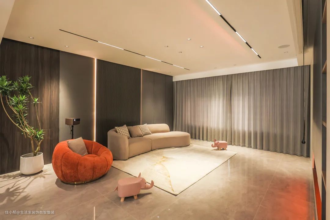 黑胡桃色木饰面、现代格栅背景墙、墙内嵌灯带、米色舒适的异型沙发和亮橙绒布单人沙发,反传统却浪漫舒适。
