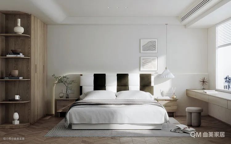 相较于其他空间的明朗视觉,卧室在纯白色的墙体掩映下,稍显暗淡的原木色可能更有助于睡眠;衣柜转角设置展示架,放置工艺品较多;靠窗是定制的书台,以木饰面延续原木色的自然风格;床头墙面以灯带分割出层次感,是极为高级的空间视觉表达。而在这样的空间中,充足的自然光线在白色大床上轻描淡写、随意勾勒,便是一幅最具生活景象的画卷。