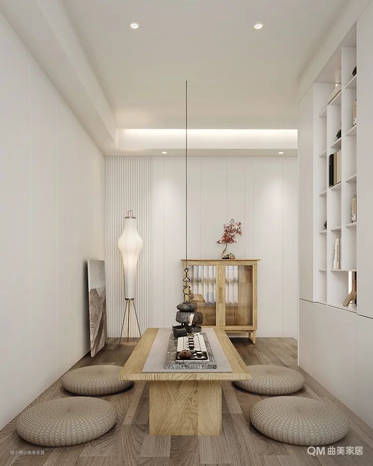 沿着客厅拾级而上是一个精致的茶室,四个蒲团围着一方矮桌,便是一个清清静静的品茗之地,搭配的装饰品在随意中又透着户主极具风格的审美品位,一幅油画、一个别致的灯具、一个斗柜足以;另一侧靠电视墙是嵌入式的置物格,随意放置一些书籍、工艺品,简简单单、大大方方。