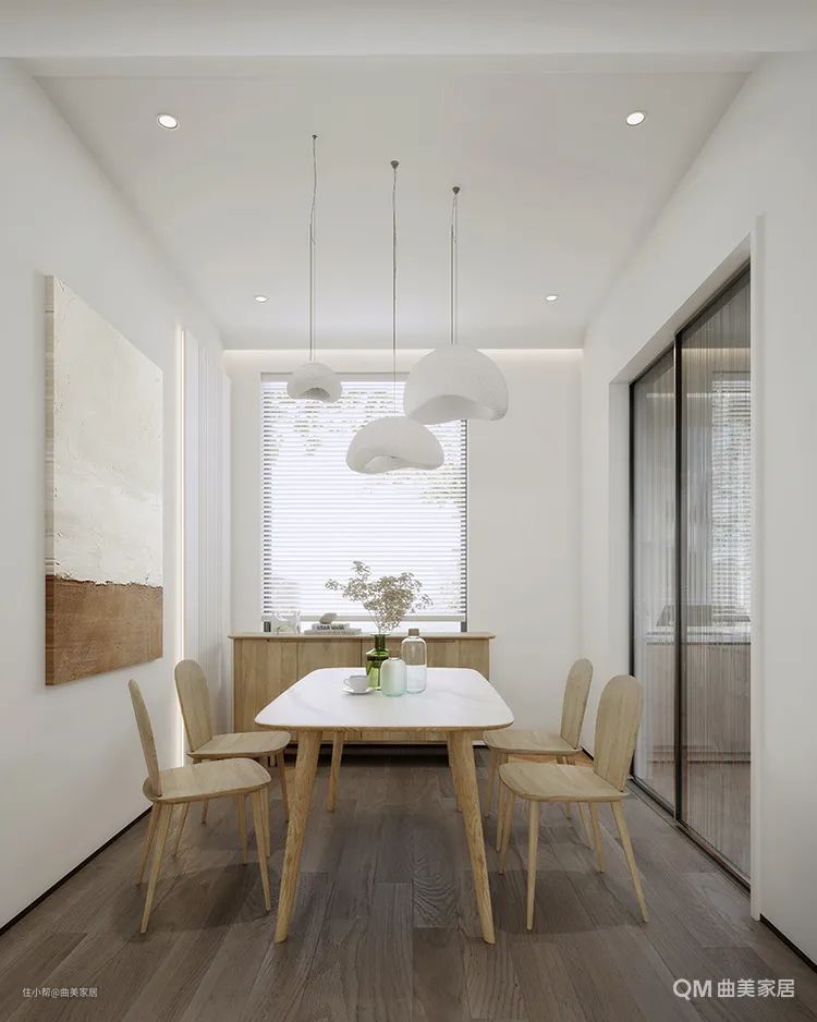 餐厅的氛围感是一如既往的素雅整洁,这种风格的延续性和连贯性,让整体空间有了既功能分离又观感统一的协调感。唯一的不同大概在于餐桌的桌面非实木罢了,但岩板的台面却有着木材比拟不了的优势:好打理、不怕烫。不一味追求材质的统一,因地制宜选用恰当的材质,才是明智之举。
