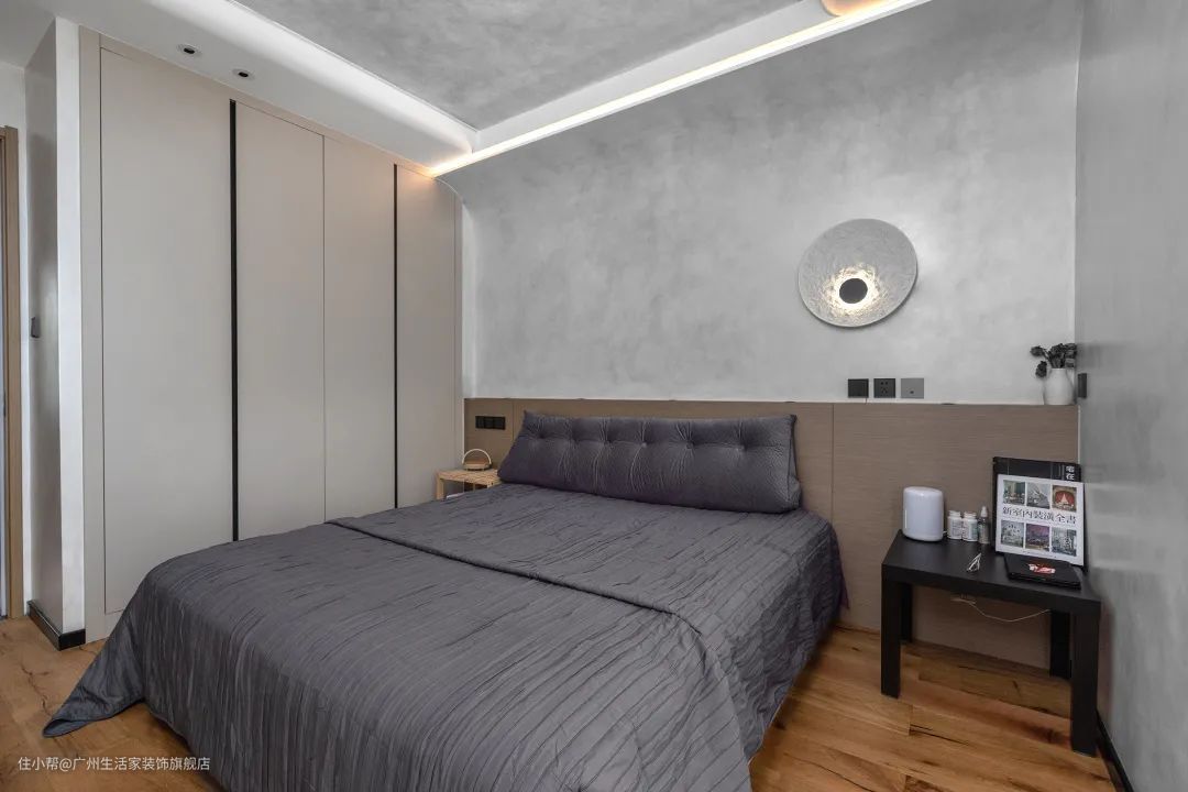 通铺原木地板,增加舒适感的同时,与客厅的局部地板遥相呼应;深灰色床品更显沉稳,搭配艺术床头灯,营造温馨十足的睡眠氛围。