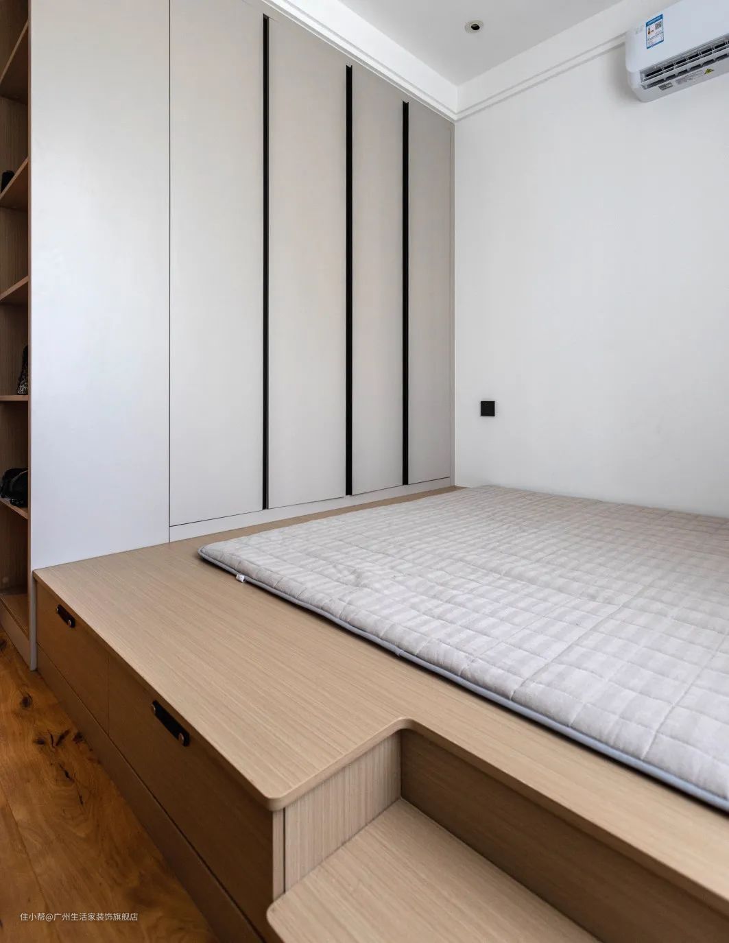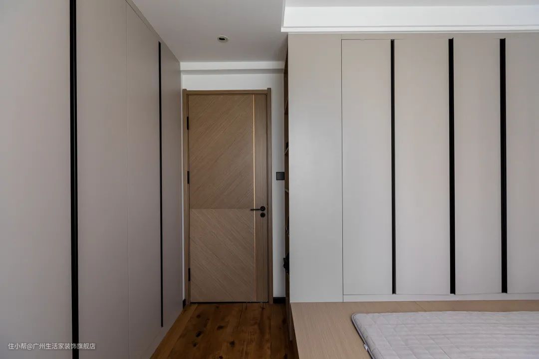 次卧做榻榻米设计,搭配通顶衣柜,轻松满足收纳需求;柜体和墙面的黑色线条,与主卧的柜体设计保持统一,空间连接性更强。
