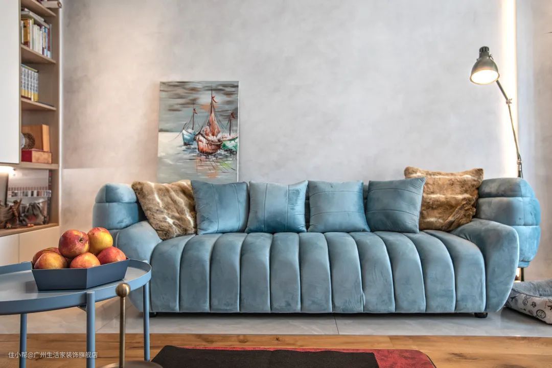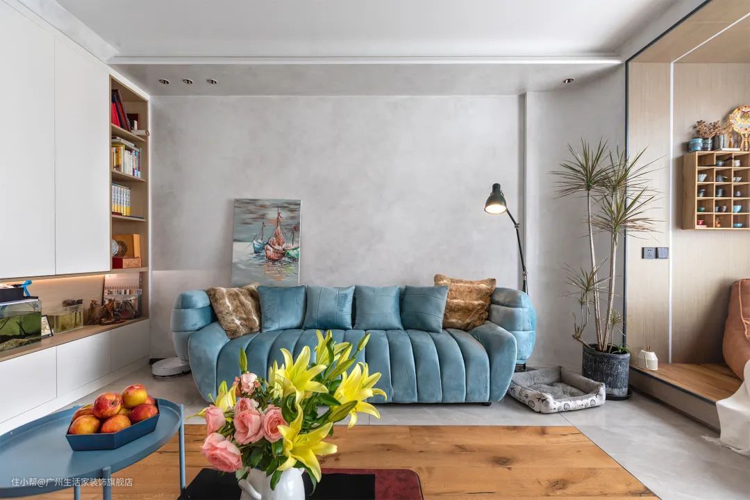 蓝色沙发可谓点睛之笔,丝绒材质也调和了空间氛围,增添了一丝温馨的雅韵。背景墙采用留白设计,一幅简单的艺术挂画便足够惊艳。