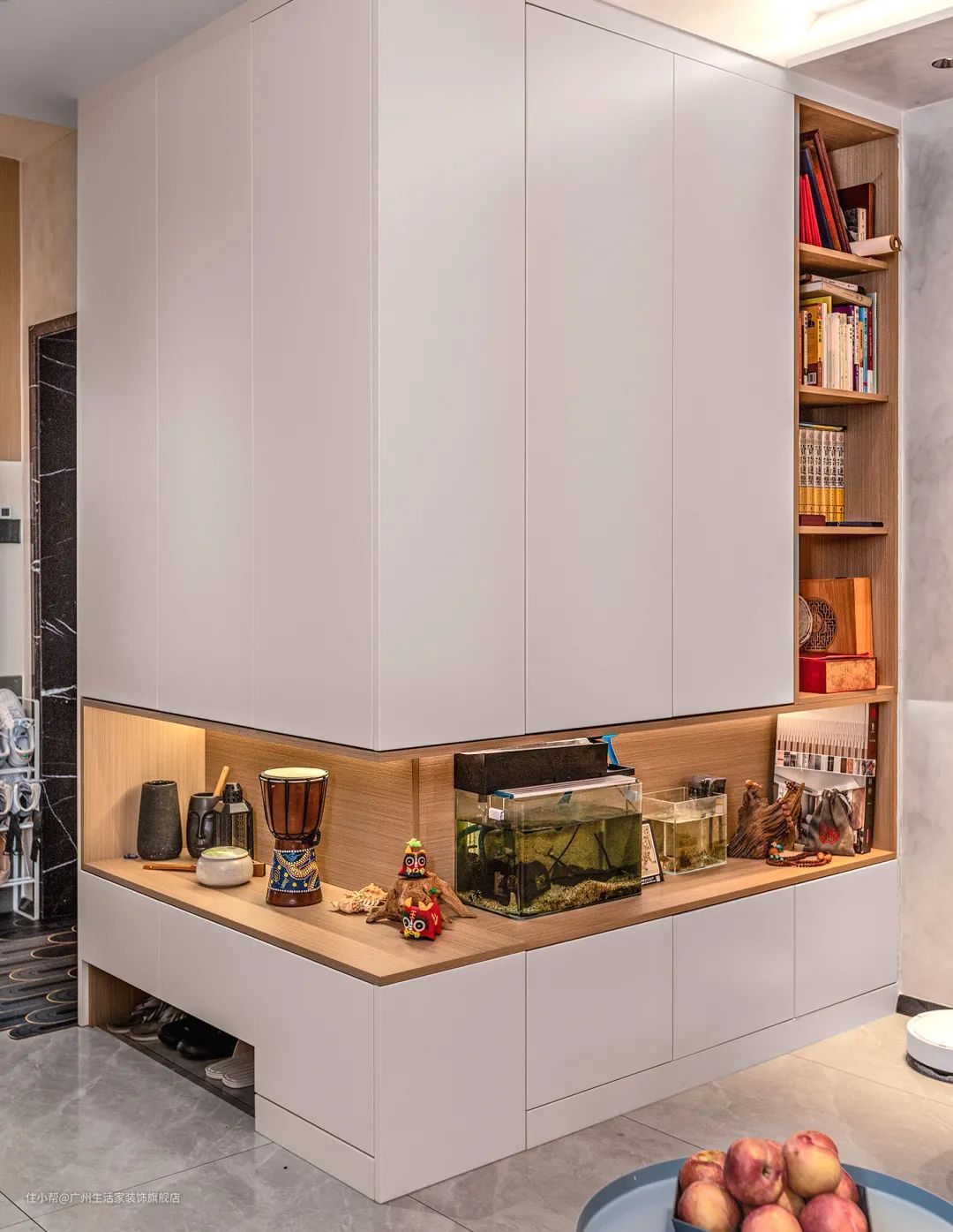 进门即是客餐厅,玄关空间有限,打造通顶玄关柜,靠客厅一侧做书架,下部挖空做置物台+日常鞋子收纳。整个玄关柜从门口延伸至客厅,一气呵成,也从视觉上增加了空间感。
