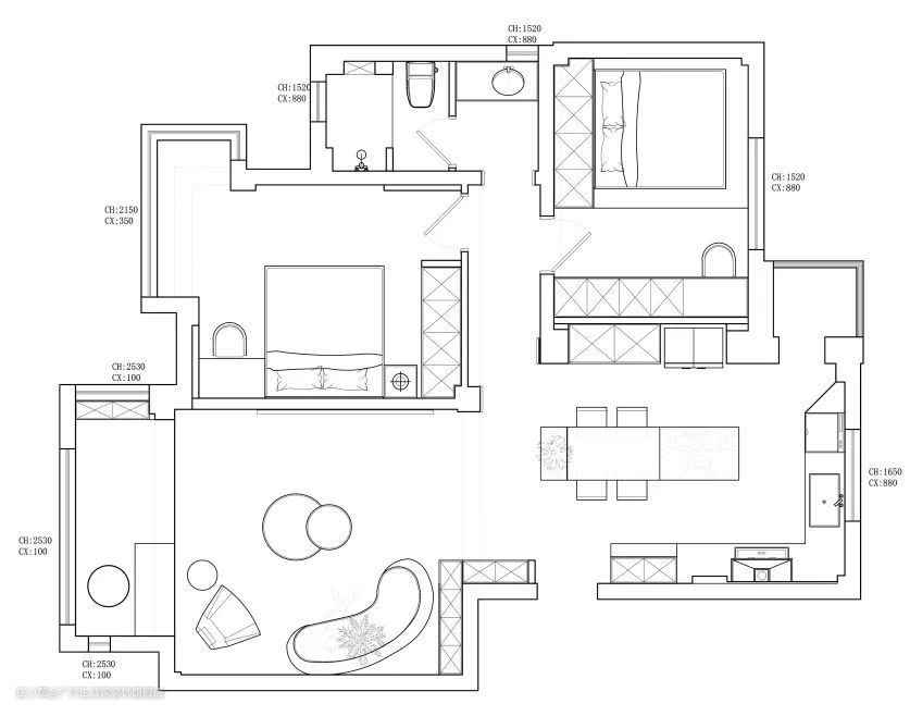 全屋高级的灰白配色,干净利落的细节处理,恰到好处的色彩搭配,相较于一般侘寂风的高冷范,设计师更偏向充满烟火气的温馨感。