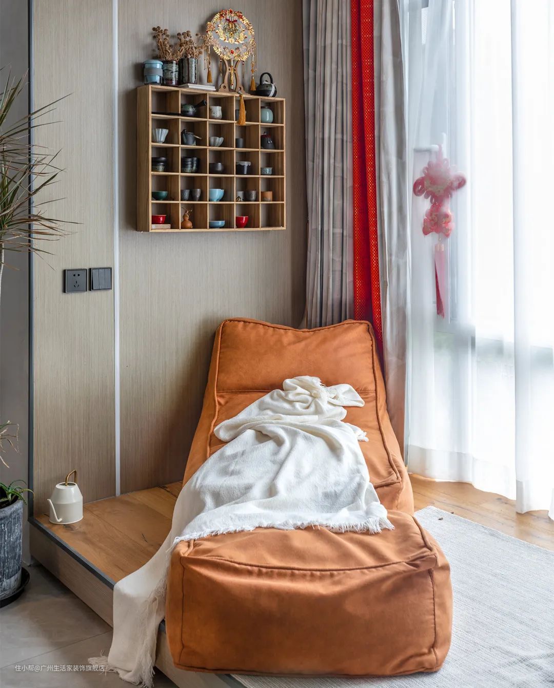 阳台扩入客厅,超大落地窗引入采光;木质地台设计,从视觉上与客厅进行区分。为了追求舒适感,阳台的墙面和顶面也选用了木质材料;墙面根据喜好,还做了一个收纳茶具的展示柜。