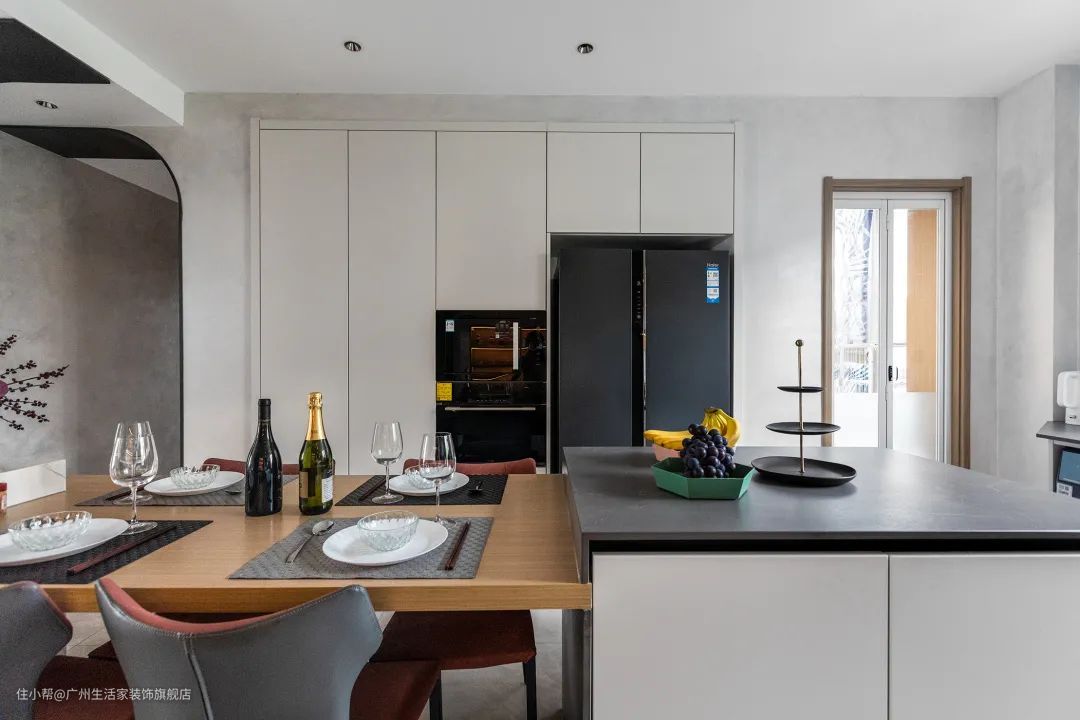 厨房墙面采用大面积岩板,容易清洁;内嵌式厨电,把空间利用到了极致。原来的厨房是封闭式,现在做全开放式设计,取物,洗涤、处理、烹制,上菜,动线规划非常方便。