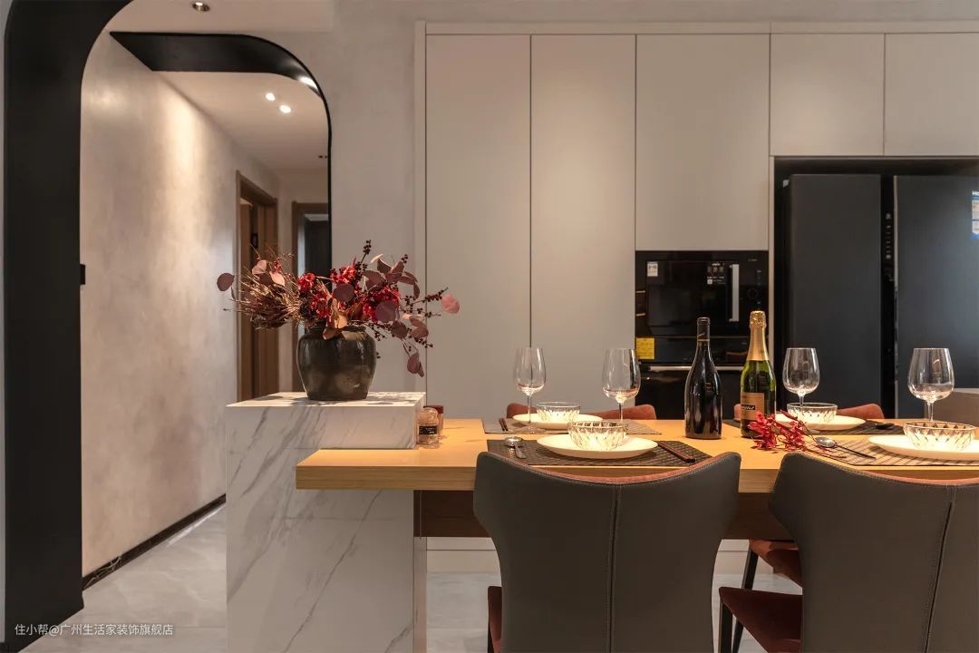 餐厨空间利用岛台+餐桌一体的方式打通,岛台留了充足的收纳空间,餐桌稍矮几公分,原木餐桌+灯光氛围,营造温馨浪漫的用餐氛围。