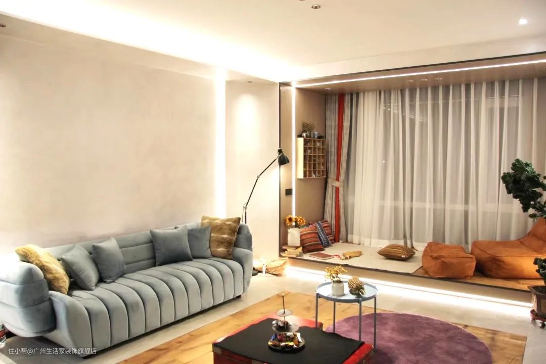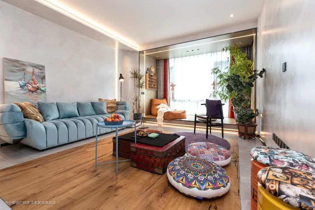 步入客厅,丰富的色彩让人眼前一亮,以侘寂为基底,却又完全跳脱出传统的单调。