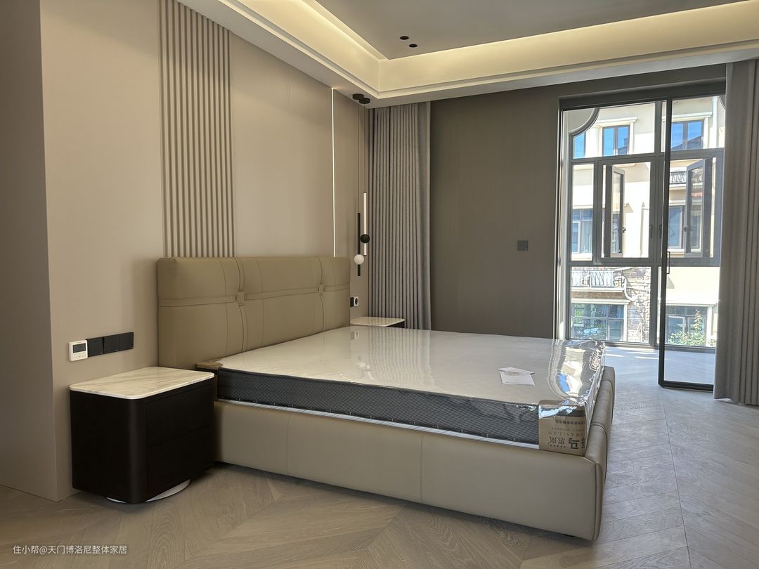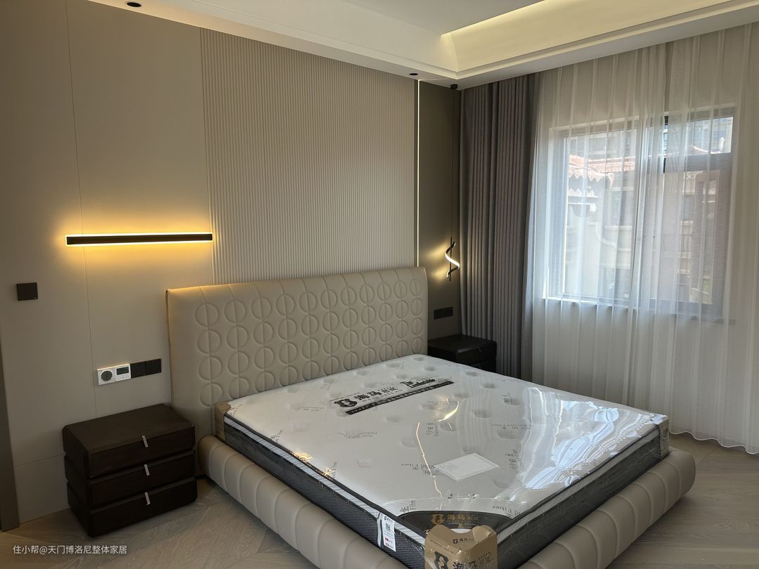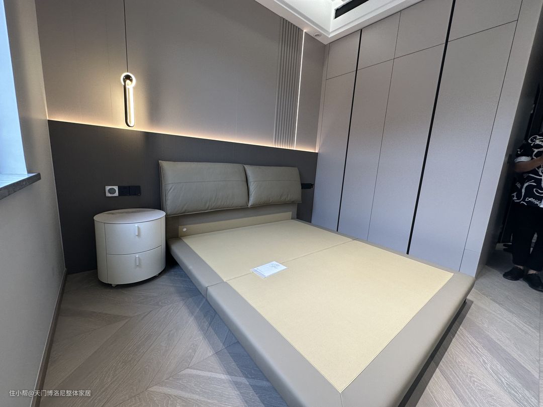 床头背景墙是子午灰纯粹墙板搭配竖纹格栅,在黄金比例处我们设计了一个嵌入式灯带,给整个空间带来了一丝光影灵动性。在软体方面,配的是一款博洛尼的库尔斯真皮皮床,搭配两个岩板亚丁床头柜。