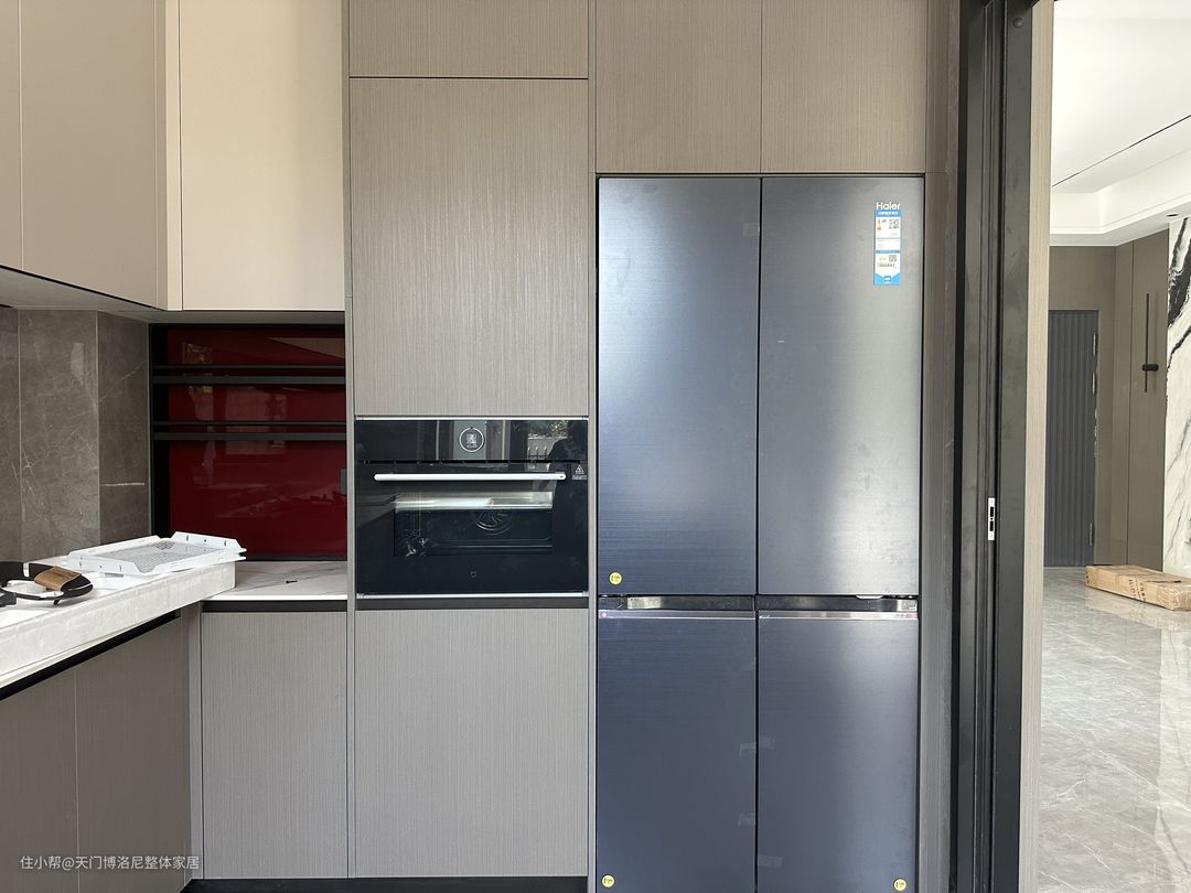 餐厅的U形动线,合理规划了备餐、烹饪、洗涤、收纳等功能。做了筒柜,冰箱平嵌,更美观。
