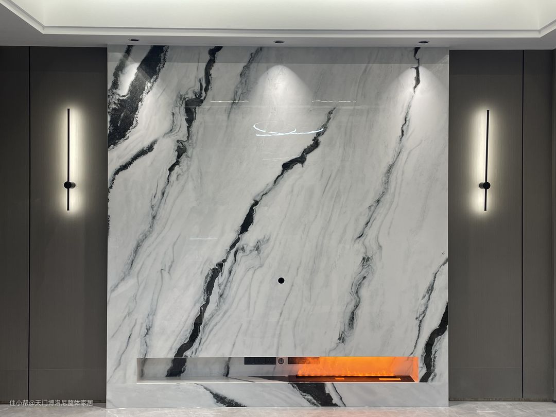 摒弃浮夸的元素,电视背景做了一面石材左右对称式设计墙板,整体一楼客餐厅全屋墙板做围合,增加了空间的统一协调性。