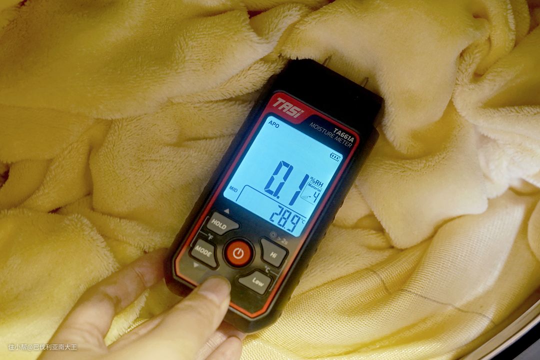 按下继续键,等完整的1小时快速洗烘结束后,用湿度仪检测到已经降至0.1%了,这是它能测出的最低值,四件套实际摸起来的手感已经全干了。