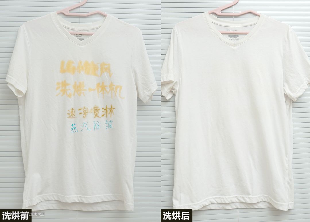 看下最终清洁效果对比,白T恤表面从上至下分别是风干的辣椒油、火锅底料、彩笔画痕,在我完全没有预先手洗的前提下,全部被洗烘的干干净净,没有一丝痕迹。