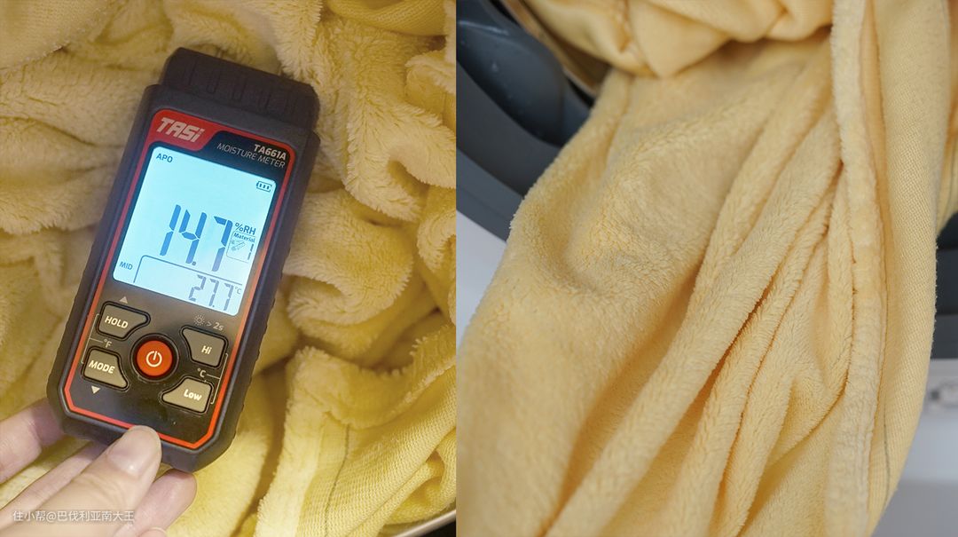 甩干结束后我按了暂停键,打开舱门,用湿度检测仪测了一下四件套的含水量,实时数值显示只有14.7%的含水量。