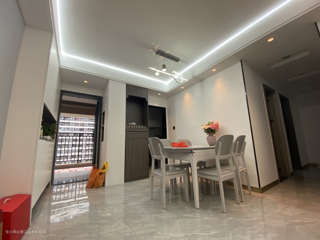 餐厅位于入户的过道位置节省占地面积,选择淡雅的浅灰色餐桌组合更符合主体空间感。