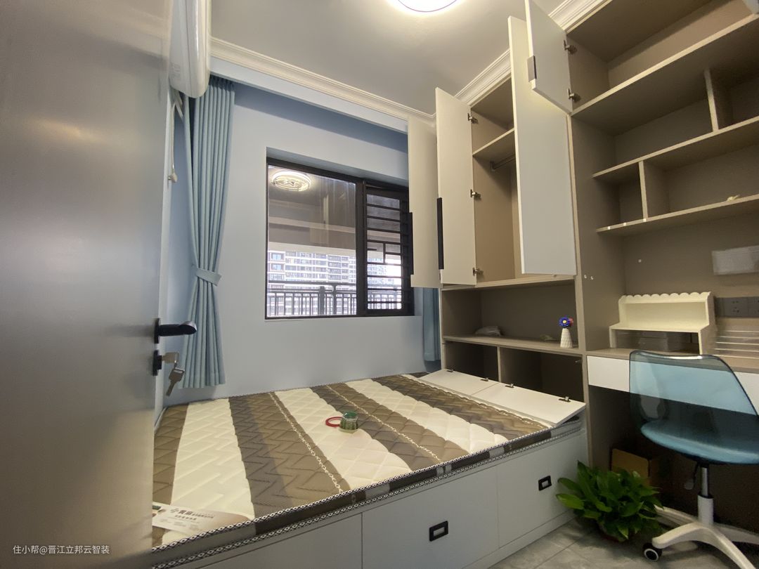次卧的功能主要是表现在收纳和学习办公,采用榻榻米床与其墙面收纳柜延伸出书桌的功能,既不显拥挤又简约自然。