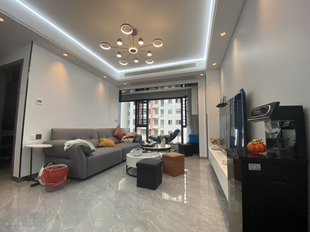客厅洁明的白色与其灰色调地砖,包括灰色沙发和一字型的电视柜都显示出极简干净的洒脱感。