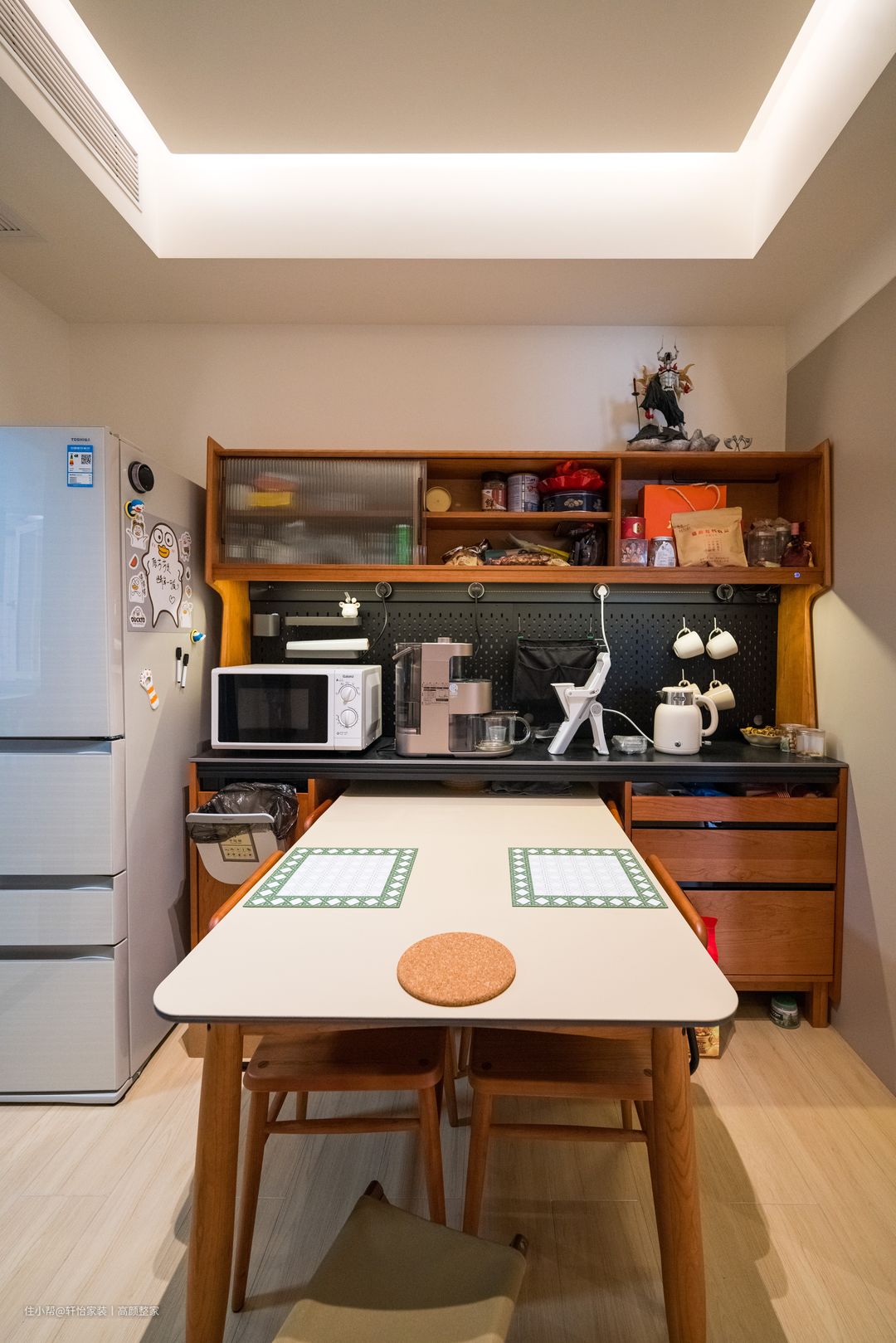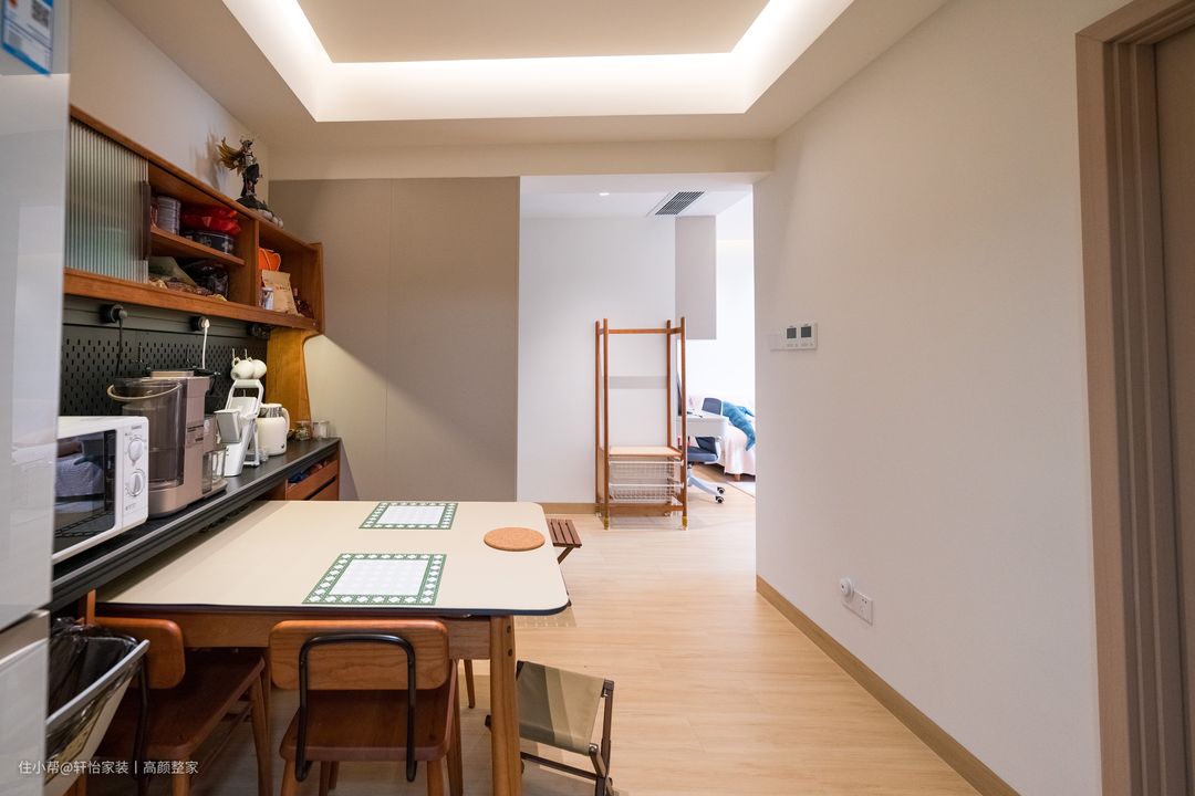 来到客厅很能感受到这里的日式格调,奶白色乳胶漆的墙面粉形吊顶上线给整个餐厅区域增加了暖呼呼的氛围感,在此处用餐总能被满满的幸福感包围吧。日式中古的樱桃木组合餐边柜,实现了置物、用餐、收纳以及美观装饰的多重效果,兼具高颜值与高利用率是小户型的参考之选。