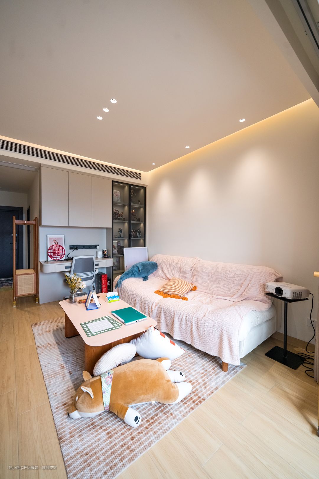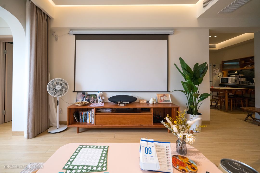 屋主没有安白色幕布的安置可供闲暇时看电影,白色背景简洁不繁琐,一定程度上可以增加客厅空间视野,实木电视柜可以放书也可以摆放家里的藏品,看上去十分高级美观。