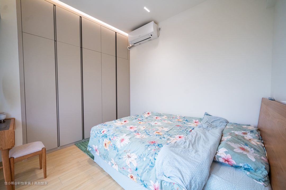 主卧空间较小,承接了全屋的现代混搭风格,到顶收纳柜的嵌入定制给予小卧室里有充足的收纳条件,同时到顶设置能起到很好的防尘作用,减少繁琐的清洗困