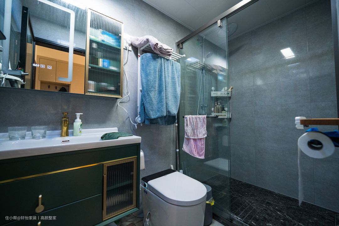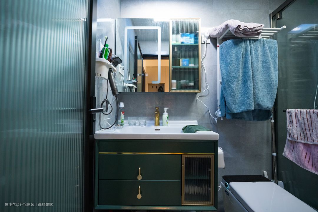 智能镜柜的安装十分美观,镜子背后可以摆放洗漱用品和护肤用品,减轻浴室的空间收纳压力,墨绿色搭配金属框的柜体饱含复古质感,为卫生间带来些许视觉高级感官。