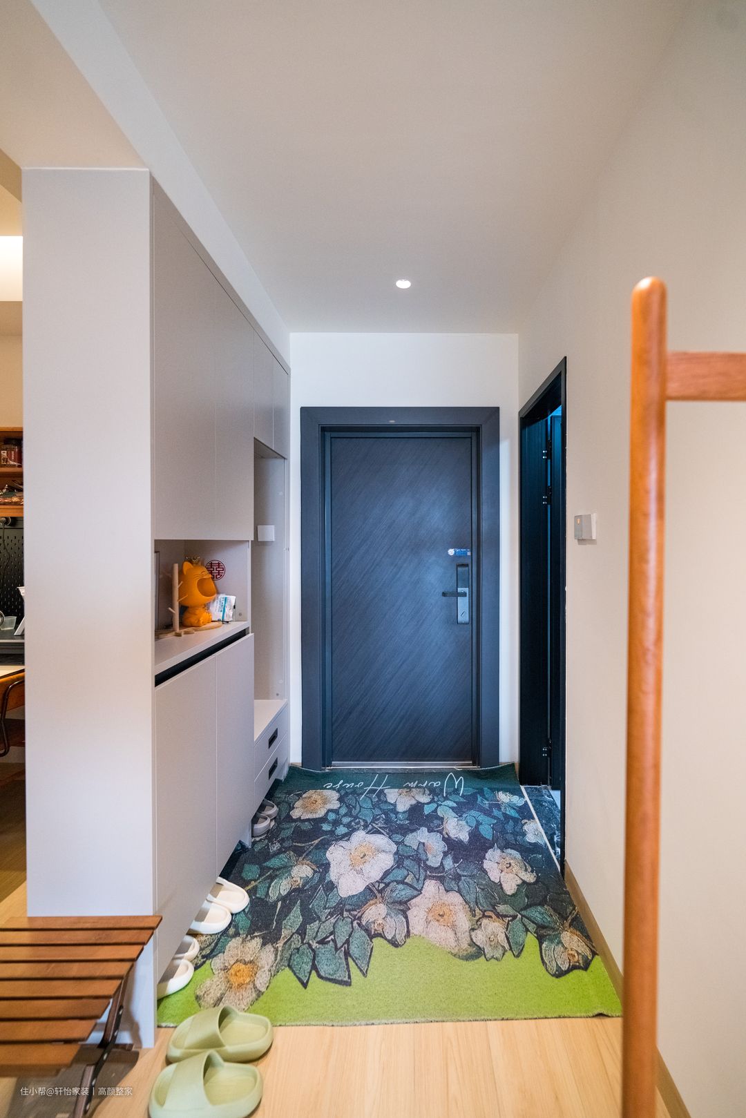 入户玄关处右侧是定制了到顶玄关柜,整体以纯白色柜面呈现,搭配黑色边框,色彩搭配清新不复杂,玄关柜有两处挖空部分,靠左凹槽部分可以摆放钥匙、香水的物品,方便屋主出行时使用。靠右处做了换鞋凳,可以悬挂衣物在壁挂上。值得一提的是,玄关柜下留空,可以摆放日常穿的鞋子。