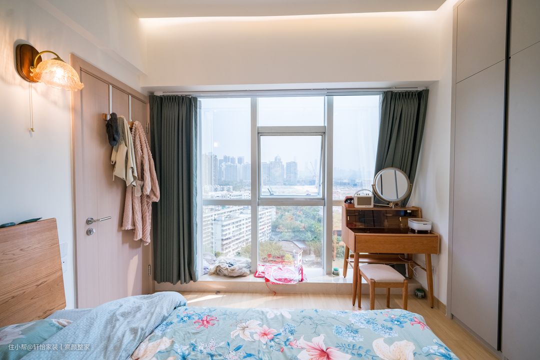 窗边处做了一个低矮的榻榻米定制,留出更多空间给整扇落地窗户的安转,兼具时尚感现代感的同时能够点亮整个卧室空间。