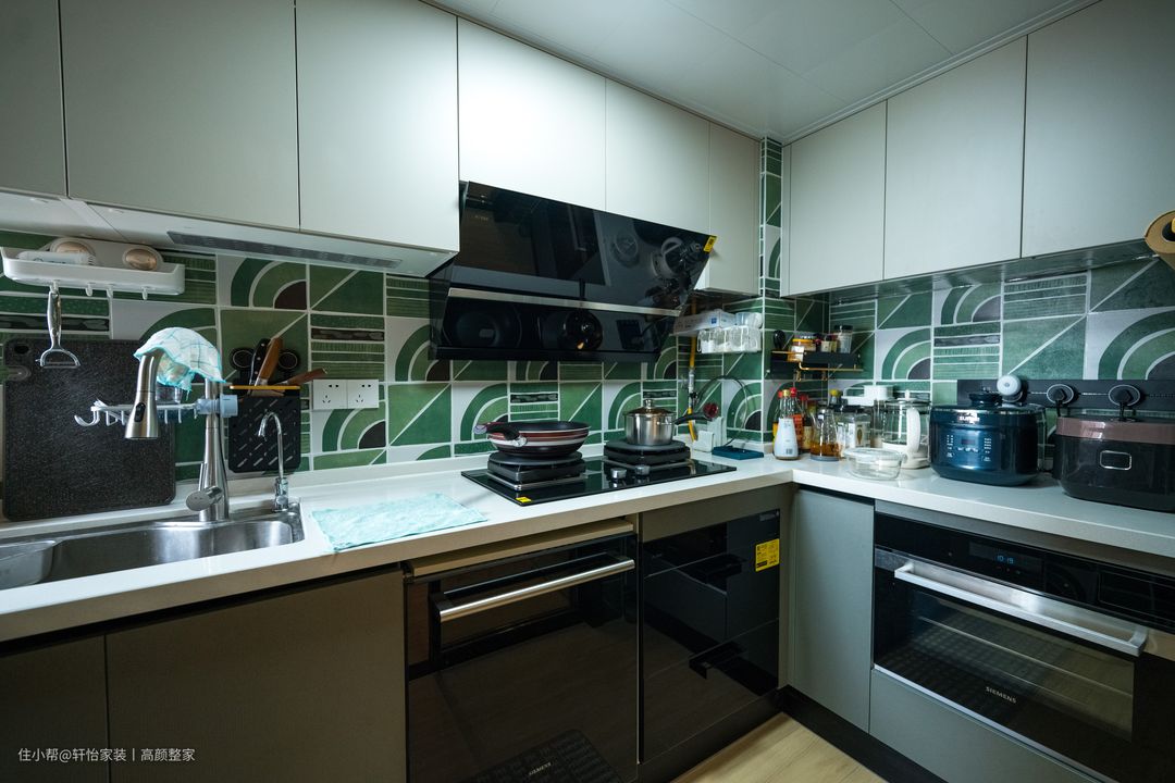 厨房空间不大,L型厨房的设计有助于使厨房动线更为流畅,能够容纳更多物品,嵌和消毒柜不占台面空间足处体的需求。饱和度不一的灰色系橱柜,让厨房空间显得高级简洁,而墙面的绿色花纹砖又增添了清新活跃气息~~