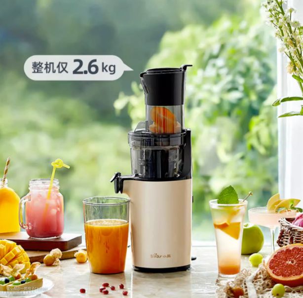 小熊这款原汁机首先个头小巧,正面还标有小熊的logo,辨识度非常高,80mm的口径的收纳起来不占地方,而且果汁杯和结扎杯设计的很巧妙,可以收纳的地方直接套在机头上,整个机身只有2.6KG,非常轻,女生也能轻易拿起。