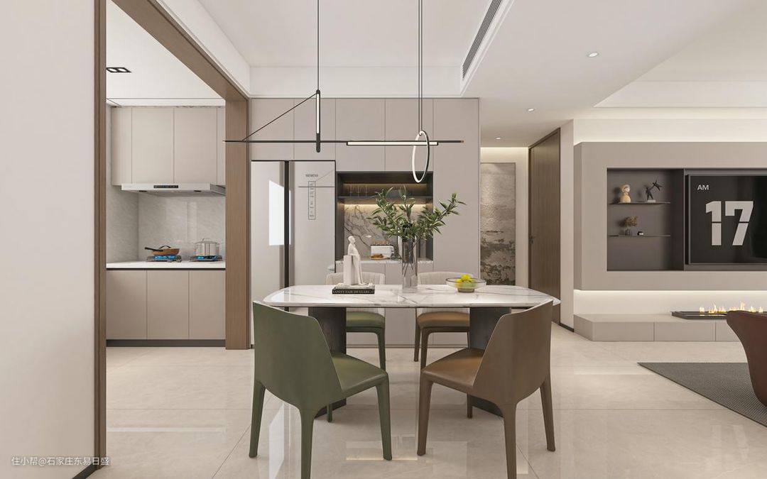 餐厅空间延续了简约风格,白色大理石台面,搭配棕色、绿色的餐椅,颜色间的想到碰撞,显得整体富有层次感和高级感。