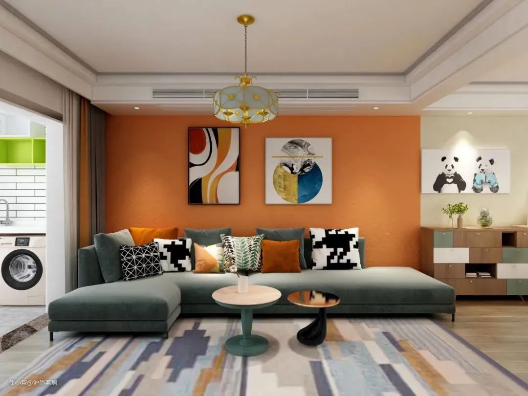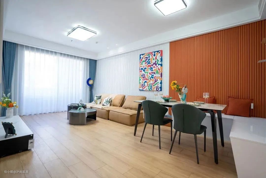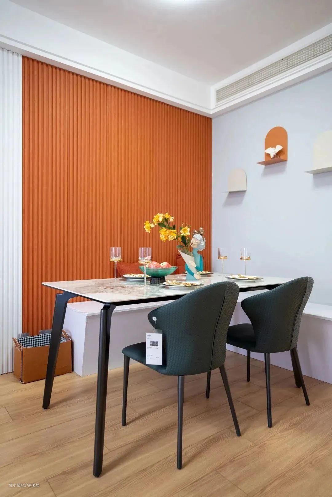 餐厅背景墙铺设了大面积的橙色,客厅沙发也选用了饱和度稍低的橙色,以活力橙为主题色,窗帘、挂画、装饰品选用不同饱和度的蓝色系,点缀其中,营造一种活力满满,但不失优雅宁静的家居氛围。