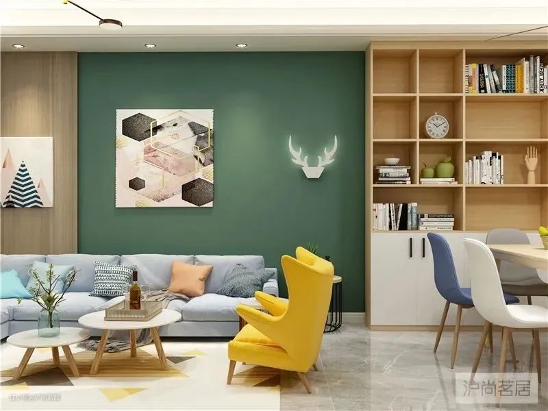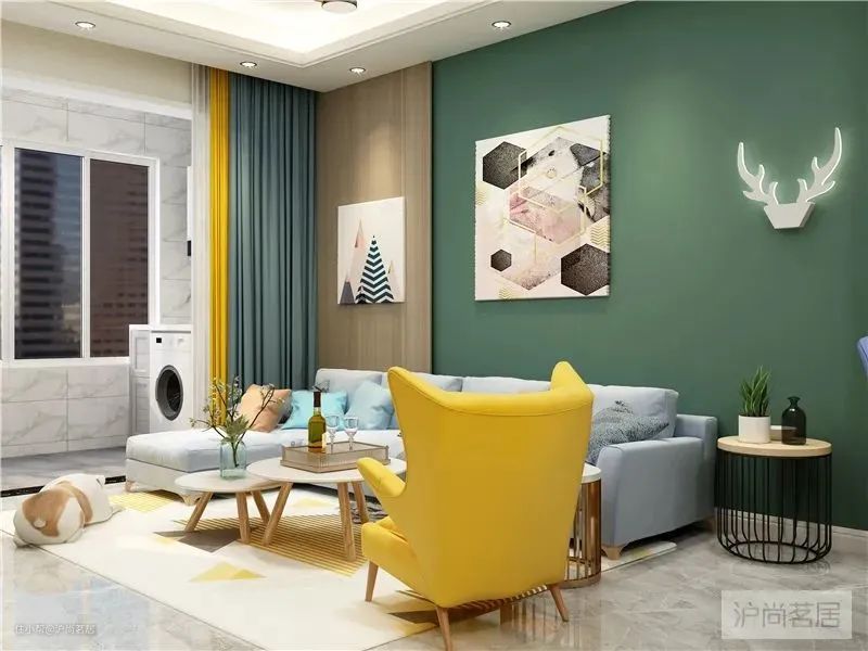 墨绿色背景墙将清新的自然空气带入室内,搭配活力柠檬黄,整个客厅空间自然而不失俏皮,将春日的氛围感拿捏了!