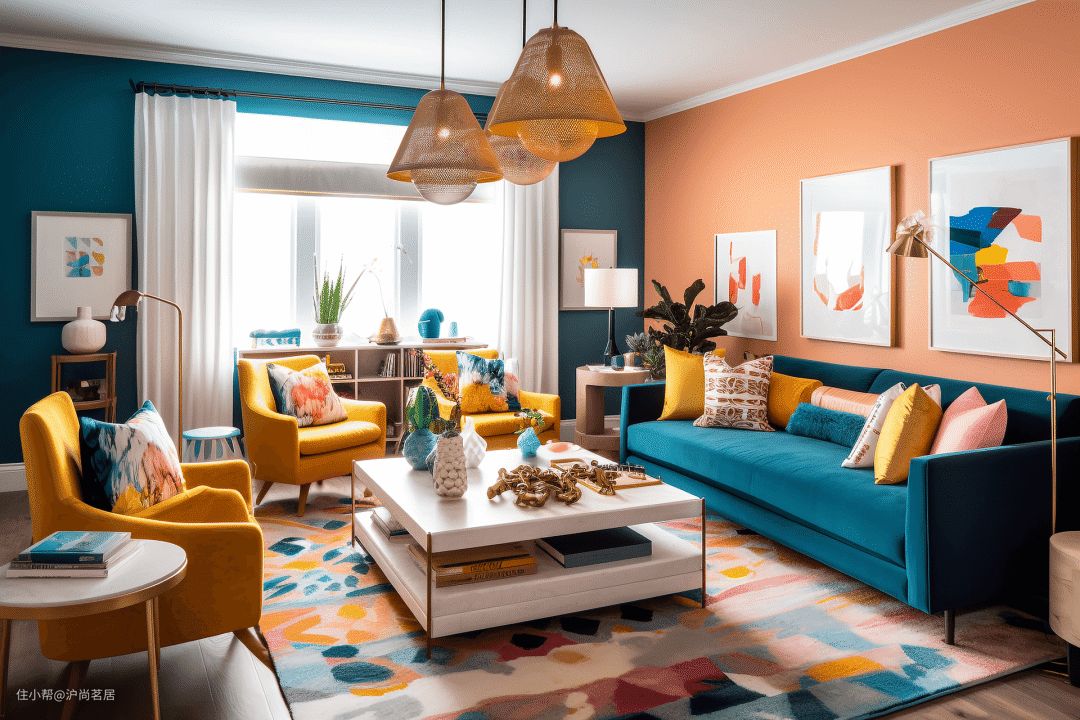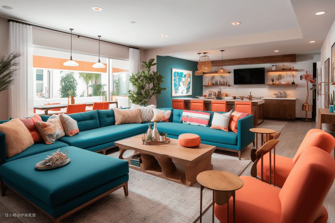 多巴胺风格的家居,通常会搭配高饱和、明亮、鲜艳的色彩,比如橙色、黄色、蓝色等,这些颜色能够打造充满明亮活泼的氛围,元气满满,产生愉悦和兴奋感,让人的心情瞬间明朗。