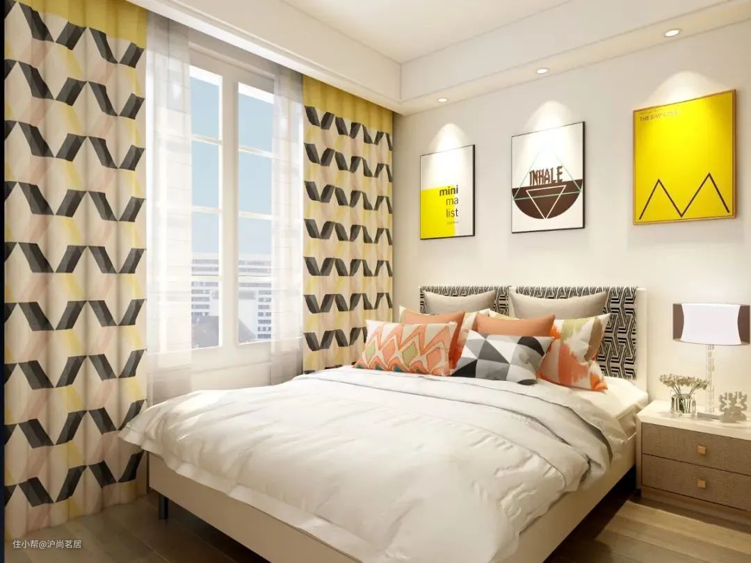 黄色容易让人联想到太阳,通常会给人热烈、愉悦的心里感受,同色系几何窗帘与床头艺术挂画相互呼应,利用充满活力的色调,打造出一个宜居空间。