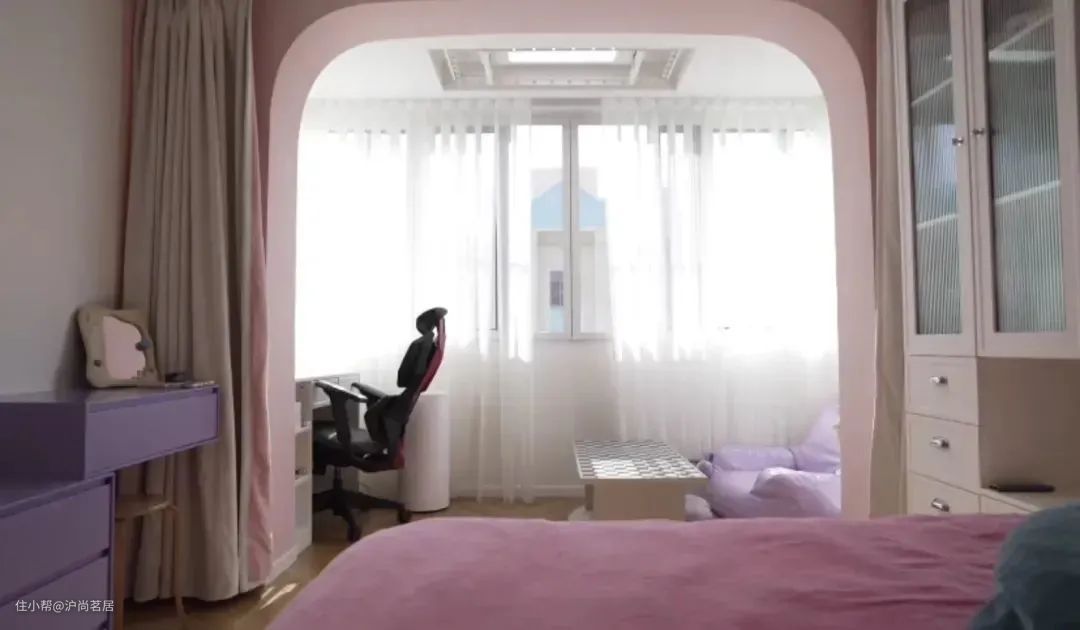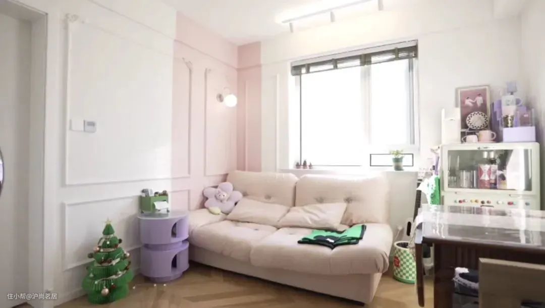 背景墙和沙发选用同色系的樱花粉,茶几、收纳盒等选用了梦幻紫点缀其中,对色彩克制的使用,不会让装修风格落于俗套,又满足了屋主对于公主风的喜好。