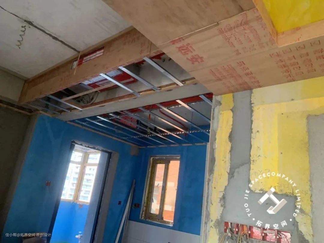 根据施工图纸弹出吊顶造型大放线,确认施工的各个位置、各个造型的位置线以及各个吊点的位置,和家具的定位线。
