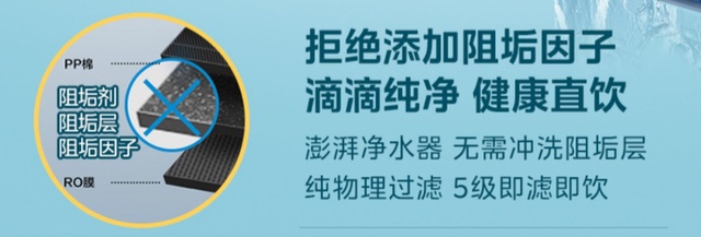 2、零添加零阻垢剂:有些净水器,为了防止水垢凝结等问题,会在净水器滤芯中添加阻垢剂,阻垢剂是会污染水质的,长期饮用不利于身体健康,所以为了自身的健康,一定要选择零添加零阻垢剂的净水器。