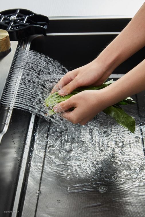 水槽分为切菜、浸泡、洗沥等区域,大大提升了使用面积,合理的分区也让台面更宽敞,特别是小户型厨房使用时会更加便利。