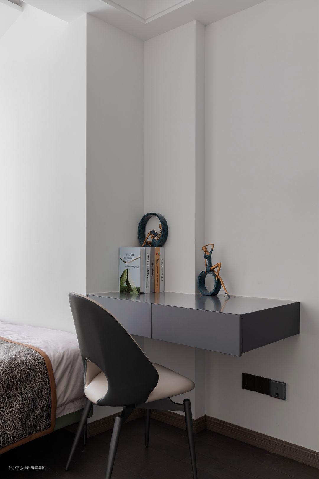 在异形转角墙体旁定制一个简易悬浮书桌,再放置一把简易椅子,在遮挡装饰墙面的同时满足日常生活中的学习阅读与收纳需求,实现实用性与美观性双重功能。