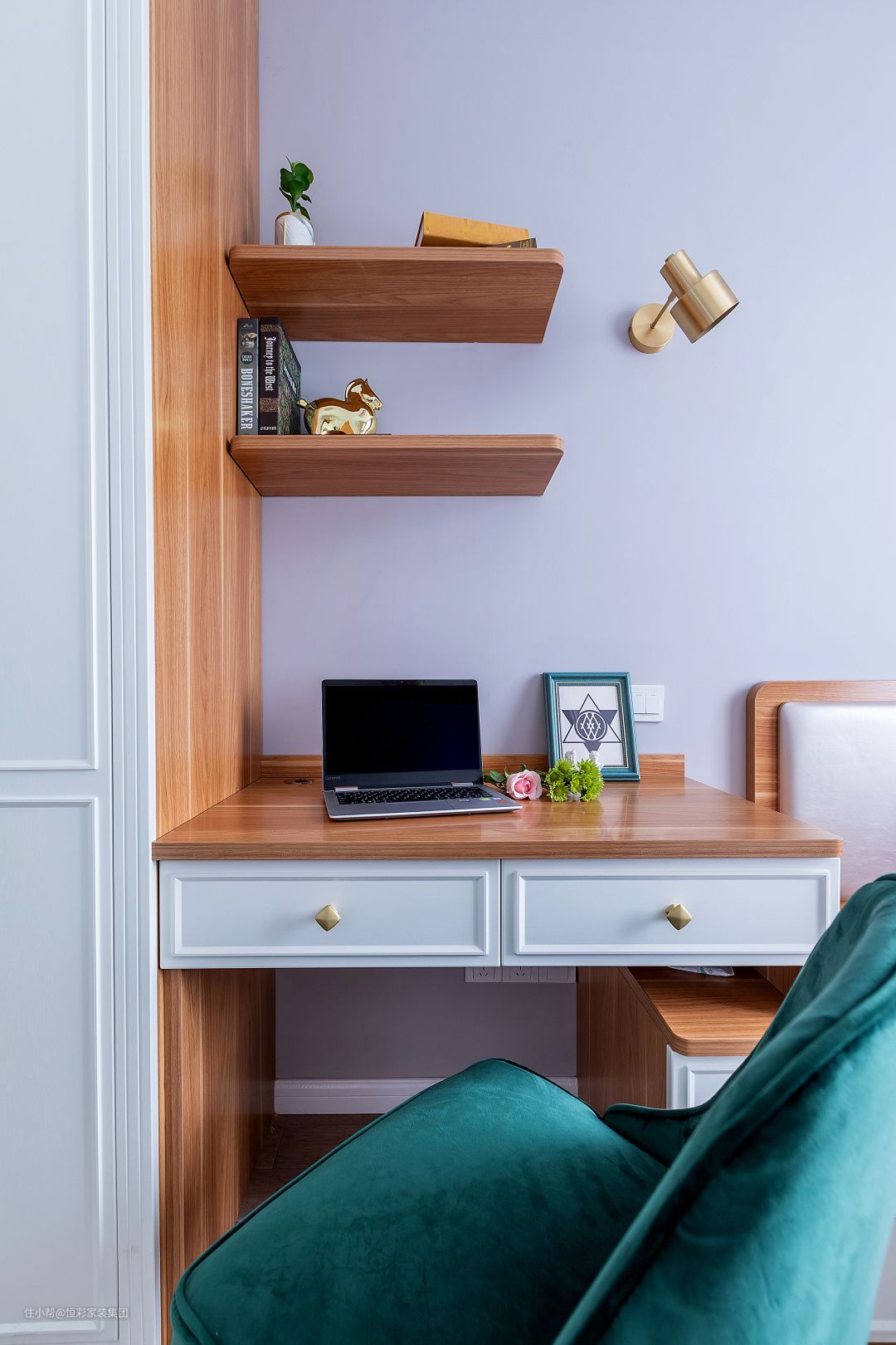 利用衣柜与墙面转角的位置,定制两层收纳格与悬浮书桌,满足书桌/床头柜日常的收纳需求,再放一把休闲转椅,就轻松打造了一个舒适的工作与娱乐空间。
