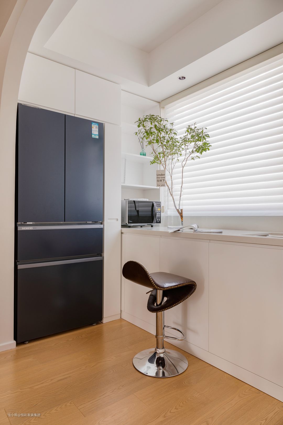 阳台空间设计为西厨区,利用转角位置满足了高柜与低柜吧台的收纳,镂空空间刚好满足了放小家电的需求,也可以放置随手的物品,一旁的定制柜刚好嵌入冰箱做隐形设计,合理利用了整个转角空间。