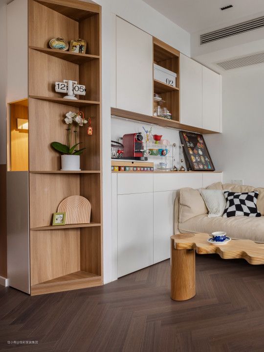 将玄关柜划分区域,外转角留空做一列开放格,弱化转角的突兀,开放与封闭相结合,可随手置物满足屋主日常进出门收纳需求,还可作为展示区打造一个整洁又美观的玄关,在实现收纳的同时兼顾艺术感。