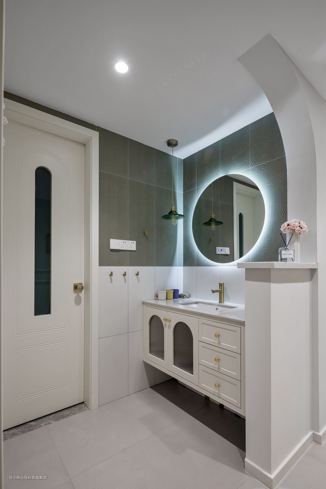 卫生间干区利用外转角,将与走廊之间的隔墙拆改成半高墙体,定制悬浮洗漱台与收纳柜,造型精致贵气,在保证颜值的前提下实现更多收纳空间。