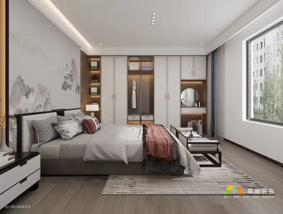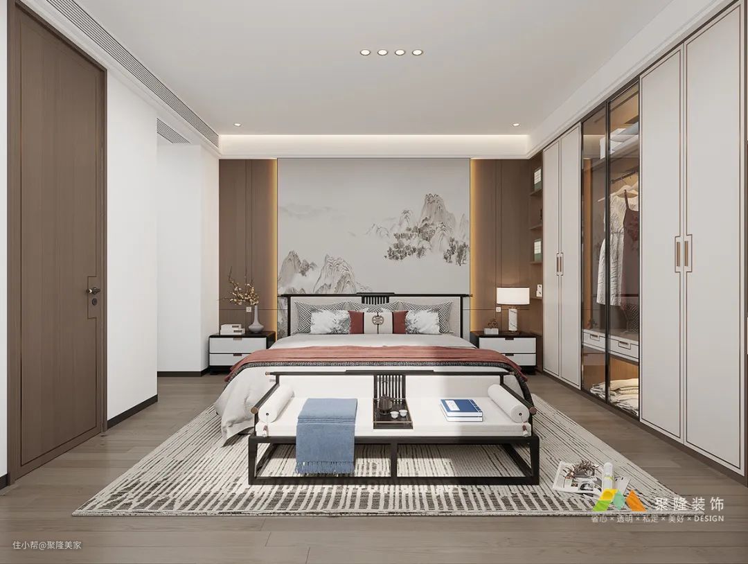 主卧无主灯吊顶设计,胡桃木护墙板搭配山水软包背景墙极具中式雅韵,中式线条+玻璃元素碰撞出现代与传统的交汇。